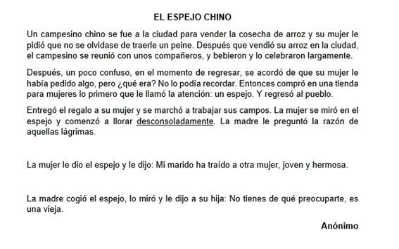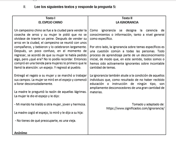 Froggy Jumps Evaluación general de comprensión lectoraOnline version Hola queridos alumnos. En esta ocasión, pondrán a prueba su comprensión lectora. Por tanto, deben leer cuidadosamente cada uno de los textos que les aparecen, ya que las preguntas se contestarán a partir de los mismos. Algunas de las preguntas que van a responder fueron tomadas y adaptadas de las evaluaciones diagnóstica que se han aplicado en el país. Esto permitirá como punto de partida para reforzar y a la vez fortalecer su comprensión. Las preguntas están elaboradas en tres niveles: 1. Identificar componentes oracionales e información local en el texto. 2. Comprender el sentido global del texto. 3. Asumir una posición crítica sobre el texto. ¡Emprendamos esta aventura! by ROSANNY OLIVO CASTRO 1 ¿Qué tipo de texto es el que aparece en la imagen? a Instructivo b Noticia c Una descripción 2 ¿Cuál es la intención del autor con este texto? a Dar una información de qué hacer en un incendio. b Dialogar sobre los incendios que han sucedido. c Exponer en forma detallada, los riesgo de un incendio 3 Había un niño muy violento. Peleaba siempre con los demás. Un día le echó un café caliente a otro niño, quien no lo pensó dos veces y le dio un trompón dejándolo inconsciente. ¿Qué refrán se adapta más a esta historia? a Agua que no has de beber déjala correr b A caballo regalao no se le mira el diente c No te fíes de las apariencias 4 La palabra¨Había¨ es un: a Adjetivo b Verbo c Sustantivo 5 Según la imagen, qué están haciendo los niños? a Dialogando entre sí, sobre temas personales b Hablando con su profesor sobre las plantas c Cuidando el entorno escolar al reforestarlo junto a su profe 6 De las siguientes imágenes, cuál se relaciona más con la música a b c 7 Silla es igual a asiento, entonces amor es igual a... a Odio b Afecto c Respeto 8 ¿Qué imagen representa una falta de respeto? a b c 9 Para bajar de peso, le pregunté a un doctor ¿Qué debo hacer? y respondió, solo mueve tu cabeza de derecha a izquierda y viceversa. le pregunté ¿Cuántas veces? y dijo cada vez que te ofrezcan comida. ¿Cuál es la intención del autor en esta historia? a Desacreditar al doctor b Contar una situación jocosa que le sucedió a una joven cuando acudió al doctor. c Decir cómo rebajar de peso 10 Qué significa el siguiente refrán ( Se hizo el chivo loco) a Que es muy inteligente b Que no le de importancia a lo que se le dice o pasa c Que es desaplicado en todo 11 En la parte subrayada del texto, la autora utiliza un argumento que está a Generalizando las dos ideas planteadas. b Refutando lo que se creía anteriormente. c Comparando las ideas planteadas anteriormente. 12 En el texto, ¿a quién va dirigida la frase? “No tienes de qué preocuparte, es una vieja” a A la madre de la mujer del chino b A la mujer del chino c A los amigos del chino 13 ¿Cuántos párrafos tiene el texto leído? a 5 b 3 c 4 14 Qué tipo de texto es el que acabas de leer? a Divulgativo b Expositivo c Narrativo 15 En cuanto al contenido, ¿Qué relación tiene el texto I con el del texto II? a El texto I habla sobre lo fea que era la esposa del chino y el II habla sobre la ignorancia. b El texto I trata sobre la ignorancia de la mujer del chino y su madre y el II define la ignorancia. c En el texto I el campesino se reúne con sus amigos y en el II no se menciona al campesino.