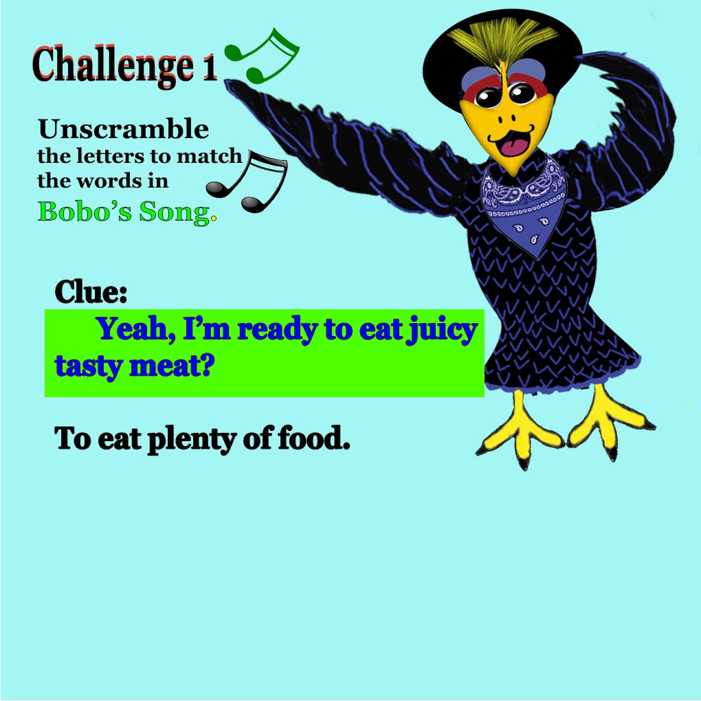 Unscramble Letters The Rocking Adventure of Bobo @www.bossreaderproductions.comOnline version Challenge 2 (7Words to unscramble in this game) Spelling and vocabulary definitions, recognition and spelling of words by Belle House 1 To eat plenty of food. F E A T S 2 They guard cornfields W R E C A R S O C 3 Jolly likes to read and is a ? R I E V E R O B H 4 Animals that eat plants are called? E V B E O S R H I R 5 An animal that hunts other animals for food are called? A D P O E S R T R 6 What do you call someone who eats both plants and meat? V O I O S E M R N 7 The ________ are always right T A F C S 8