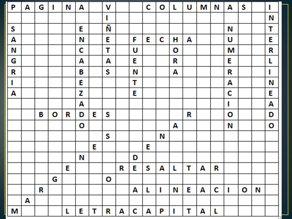 5.      Escribe las 16 palabras que se te indican en la tabla: página, columnas, sangría, encabezado, viñetas, fuente, hora, numeración, interlineado, fecha, bordes, márgenes, ordenar, resaltar, alineación, letra capital.
