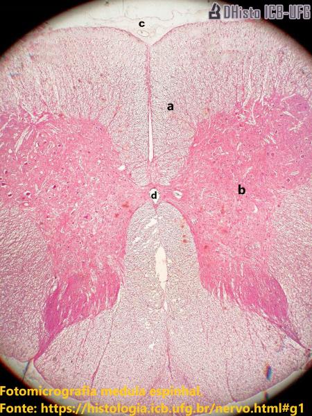 Fotomicrografia - medula espinhalOnline version Medula espinhal. H.E Jogo para monitoria de Histologia, curso de licenciatura em ciências biológicas. Orientadora: Profa. Dra. Cláudia Toscano Fonte da imagem: https://histologia.icb.ufg.br/nervo.html#g1 by Priscilla Ramos 1 Substância branca 2 Substância cinzenta 3 Meninges 4 Canal medular
