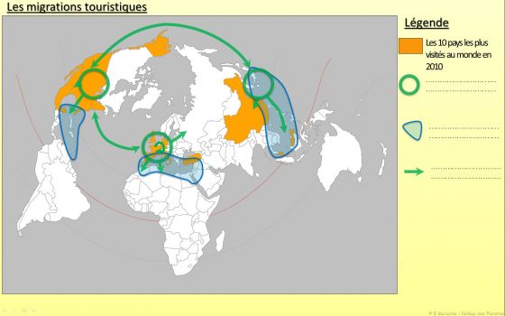 4G03 Migrations touristiquesOnline version Cartes des Migrations touristiques à compléter by Eric Malvache 1 Equateur 2 Océan PACIFIQUE 3 Océan ATLANTIQUE 4 Océan INDIEN 5 EUROPE OCCIDENTALE 6 ETATS-UNIS 7 CHINE 8 Principal foyer émetteur de touristes 9 Grands bassins touristiques 10 Flux* touristiques majeurs 11 TURQUIE 12 MEDITERRANEE 13 CARAIBES