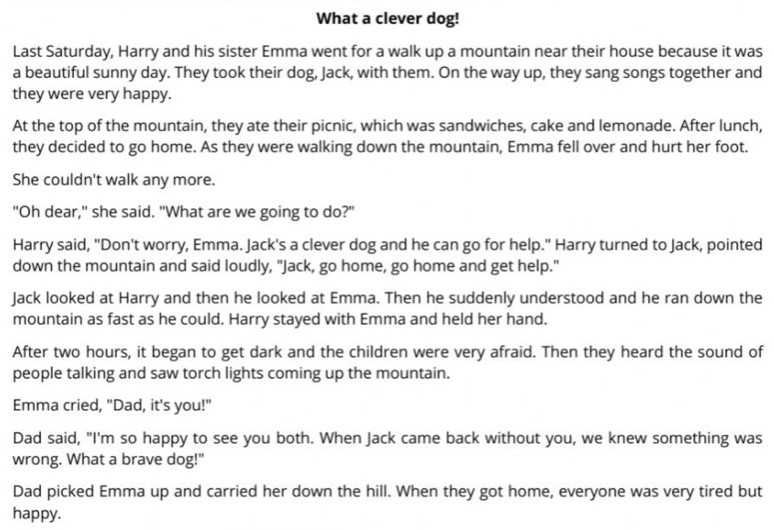 Part 5Online version Look at the picture and read the story. Write some words to complete the sentences about the story. by Roubina Saad 1 1. Harry and Emma have ... called Jack. a dog b cat 2 2. Last Saturday, it was sunny, so Harry and Emma decided to go for a walk up a a hill b to the club c a mountain 3 3. Harry and Emma ... Jack with them on their walk. a take b took c go 4 4. They had ... for their picnic. a sandwich b cake c sandwich, cake, lemonade. 5 5. As they were going home, ... and hurt her foot. a sprained her leg b fell over 6 6. Emma ... any more. a could not run b could not walk c could not dance 7 7. Harry sent ... to get help. a Jack b John c Jill 8 8. They waited on the mountain for ... before help arrived. a 3 hours b 4 hours c 2 hours 9 9. Dad ... Emma home. a walked with b carried Feedback 9 Great Job
