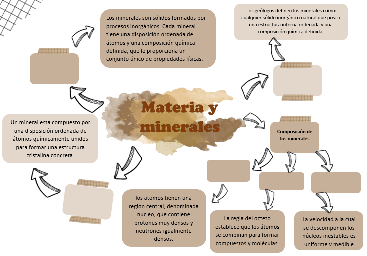 Mapa mentalOnline version Seleccionar de acuerdo al mapa by kb yito 1 Mineral: componente básico de la roca 2 Estructura de los minerales 3 Propiedades físicas de los minerales 4 Estructura atómica 5 Enlace 6 Isotopos y radiactividad