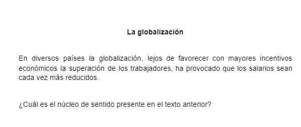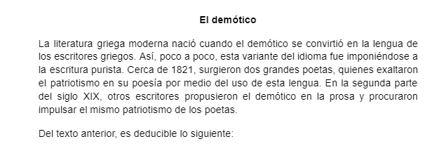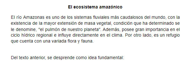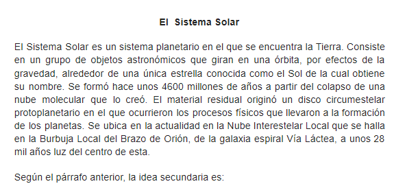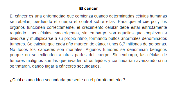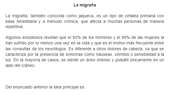 Práctica clase curso TECOnline version En esta práctica se reforzará el reconocimiento de ideas principales, ideas secundarias y deducción by Yurliana Castillo 1 1. Conteste lo que se le solicita: a A. La migraña no posee una base hereditaria. b B. En comparación con los hombres, las mujeres son más propensas a padecer de migraña. c C. Con los últimos avances en la elaboración de medicamentos, la migraña se puede controlar de una forma más eficaz. d D. La migraña es un tipo de cefalea que perjudica a gran parte de la población. 2 2. Conteste lo que se le solicita: a A. El uso adecuado de los minerales puede salvar la Amazonía. b B. El poco abastecimiento de agua potable que ofrecen los ríos del Amazonas deteriora la flora y fauna. c C. El río Amazonas es esencial para el resto del planeta, debido a que cuenta con una gran cantidad de vegetación. d D. El clima de la zona es extremadamente seco. 3 3. Conteste lo que se le solicita: a A. La globalización empobreció a todo el planeta tierra. b B. La globalización ha ocasionado la reducción de los salarios. c C. Debido a la globalización se eliminaron los incentivos económicos. d D. La globalización congeló los sueldos. 4 4. Conteste lo que se le solicita: a A. El cáncer es una enfermedad causada por la función irregular de las células, las cuales se multiplican hasta formar tumores. b B. Al año mueren más de 6 millones de personas debido al cáncer. c C. Existen tres tipos de cánceres: benignos, malignos y neutros. d D. Los tumores benignos no son mortales. 5 5. Conteste lo que se le solicita: a A. El Sistema Solar está constituido por un grupo de objetos astronómicos que giran en órbita. b B. La tierra se formó hace 3000 millones de años. c C. El Sistema Solar se formó hace 4600 millones de años. d D. El Sistema Solar se ubica a unos 28 mil años luz del centro de la galaxia espiral Vía Láctea. 6 6. Conteste lo que se le solicita: a A. los poetas escribían en demótico. b B. los puristas no escribían en griego. c C. posterior al siglo XX, los poetas continuaron con su lírica en demótico. d D. la lengua de los escritores griego fue el sánscrito. Explicación 1 La respuesta correcta es la D 2 La respuesta correcta es la C 3 La respuesta correcta es la B 4 La respuesta correcta es la B 5 La respuesta correcta es la C 6 La respuesta correcta es la A.