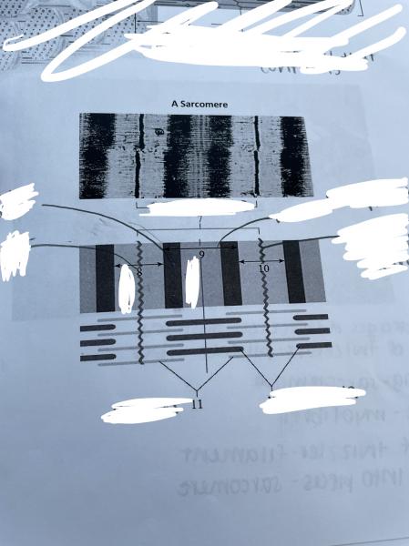 one sarcomereOnline version muscle by kinsey grause 1 sarcomere 2 actin (I band) 3 myosin 4 z band 5 a band (actin and myosin) 6 overlapping of actin and myosin 7 actin 8 myosin