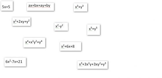 CASOS DE FACTORIZACIÓNOnline version Hallar el nombre de cada caso de factorización by Ana Aguilar 1 factor común 2 trinomio cuadrado perfecto 3 diferencia de cuadrados 4 factor común por agrupación de terminos 5 trinomio de la forma ax2+bx+c 6 trinomio de la forma x2+bx+c 7 cubo perfecto 8 suma de potencias iguales 9 suma de cubos 10 trinomio cuadrado perfecto por adición o sustracción
