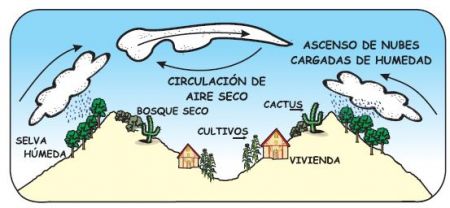El esquema representa un modelo generalizado de la circulación de los vientos y de las masas de humedad en algunos valles localizados al interior de las montañas colombianas, como por ejemplo el valle del Patía (Nariño) y el valle del Chicamocha (Santander). Una consecuencia de este efecto de puente es la disminución de la capacidad hídrica de la cuenca y la presencia de una vegetación subxerofítica. Teniendo en cuenta esto, una consecuencia en términos socio-ambientales sería
