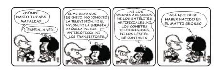 Mafalda al relacionar el nacimiento de su padre con un lugar que ella en la actualidad identifica como sin desarrollos tecnológicos ni científicos estaría desconociendo que