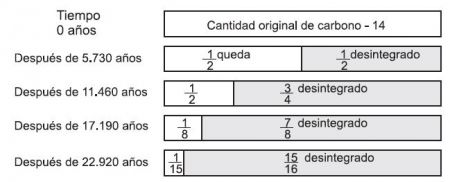 El gráfico representa el período medio de vida del carbono 14, con lo cual se puede determinar de manera confiable, las edades para algunas rocas pertenecientes a épocas geológicas tales como el