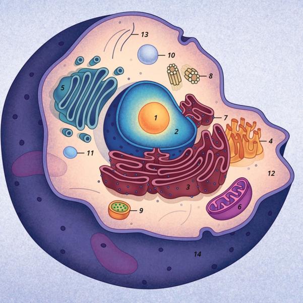 Ubicar partes de la célulaOnline version Poder identificar los organelos de una célula animal y señalarlos. by Rebeca Fernanda Gamboa Saury 1 Nucleolo 2 Núcleo 3 Retículo endoplásmico rugoso (RER) 4 Retículo endoplásmico liso (REL) 5 Aparato de golgi 6 Mitocondria 7 Ribosoma (adherido al RER) 8 Centrosoma 9 Lisosomas 10 Vacuola 11 Vesícula 12 Citoplasma 13 Microtúbulos y microfilamentos 14 Membrana celular
