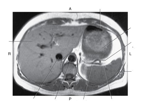 Axial AbdomenOnline version Label the anatomy correctly by kayla Jackson 1 Greater Omentum 2 stomach 3 spleen 4 splenic vein 5 aorta 6 IVC 7 liver