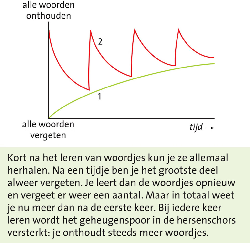 Froggy Jumps opdrachten geheugenOnline version vragen over het geheugen by giovanni harinarain 1 waar wordt de weg naar je beste vriend(in) opgeslagen? a kortetermijngeheugen b langetermijngeheugen c 2 waar wordt wat je vanmorgen at opgeslagen? a kortetermijngeheugen b langetermijngeheugen c 3 waar wordt opgeslagen hoeveel glazen drinken je mee moet nemen? a kortetermijngeheugen b langetermijngeheugen c 4 waar wordt je telefoonnummer opgeslagen? a kortetermijngeheugen b langetermijngeheugen c 5 wat laat grafiek 1 zien? a het geheugenspoor b het aantal onthouden woordjes c 6 wat laat grafiek 2 zien? a het geheugenspoor b het aantal onthouden woordjes c 7 Waar staat het verband tussen herhalen en onthouden goed? a Bij het herhalen leer ik iedere keer minder nieuwe woordjes bij. b Bij het herhalen leer ik iedere keer evenveel nieuwe woordjes er bij c bij elke keer herhalen leer ik iedere keer meer nieuwe woordjes bij 8 volgende week heb je een repetitie. wat is de beste manier om te leren? a de dag van tevoren lang leren b elke dag een stuk oefenen c hopen op een voldoende
