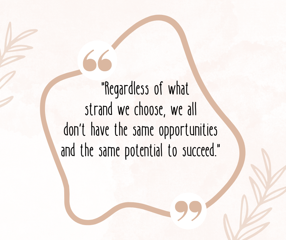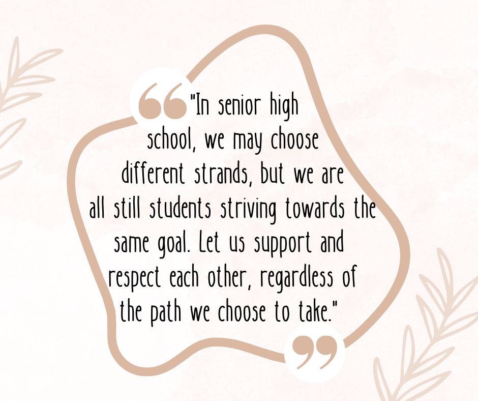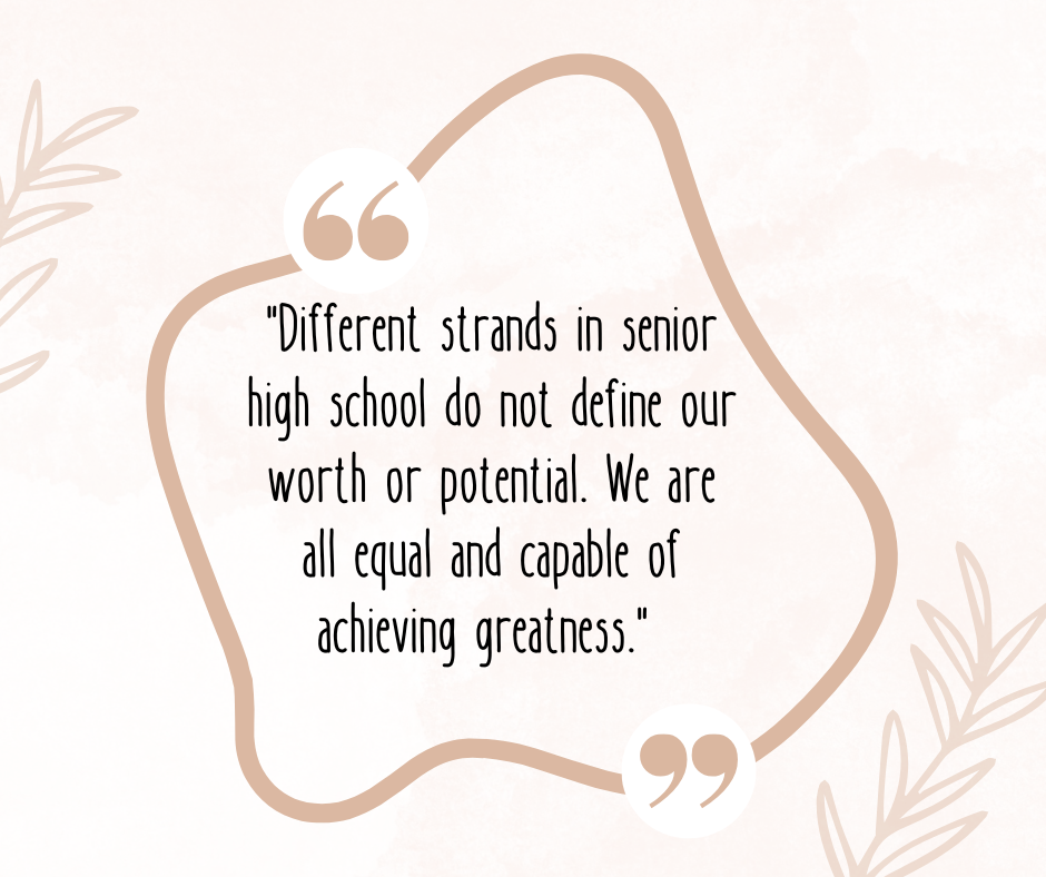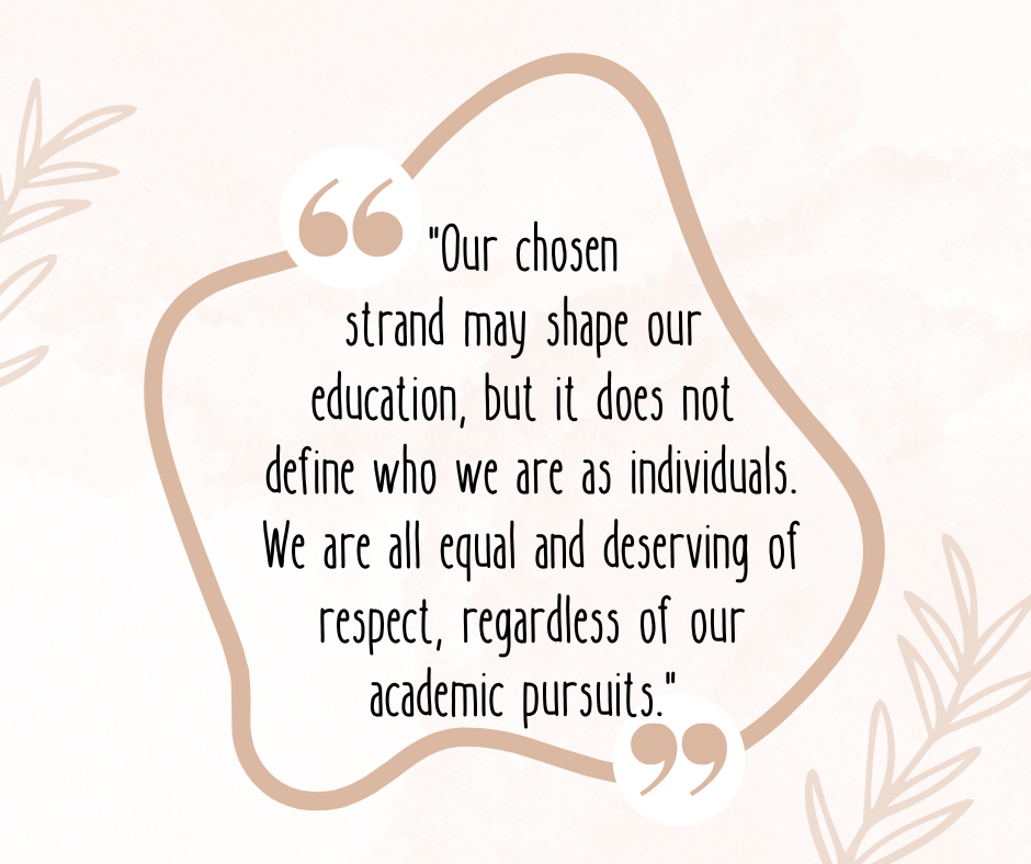 Froggy Jumps ACTIVITY 2: Stop strand discrimination. We are all equal.Online version Choosing a different strand in senior high school does not make one individual better or worse than another. In each strand, students will be provided with a variety of skills and knowledge that they can apply in their careers or higher education. We all need to be respected and treated equally, no matter what kind of strand we choose. The diversity of skills and interests which each student brings to his or her chosen field must be recognized and appreciated. The success of an individual will ultimately depend more on the effort and hard work they put into their chosen careers than on the specific senior high school tracks they chose. by Jan Angel Flores 1 what is strand discrimination? a In shs, some learners face unfair treatment and bias based on their chosen strand b In shs, some learners face fair treatment and unbias based on their chosen strand c All of the above 2 What is the hardest strand? a The hardest strand in senior high school is STEM b The hardest strand in senior high school is HUMSS c Every academic strand or program has its own unique challenges 3 What is the best strand to take in senior high school? a The best strand to take is STEM b The best strand to take is one that aligns with your interests, strengths, and career goals c The best strand to take is TVL 4 What is the cause of strand shaming? a Lack of information or understanding about the different strands b Societal expectations and peer pressure c All of the above 5 How can you decide which strand is best for you? a Consider taking a strand in the field you are interested in. b Consider what you enjoy doing and what you are good at. c All of the above 6 What are the ways in which we can avoid strand discrimination? a Address any incidents of discrimination immediately b Promote awareness and education about different senior high school strands c All of the above 7 These are the ways we can avoid strand discrimination except: a All students should have access to the same resources, regardless of their chosen strand b Don't encourage schools to ensure equal funding and resources for all subjects c Encourage schools to offer a variety of strands 8 Which quotes fits you better? a b c 9 Which quotes fits you better? a b c 10 Which quotes fits you better? a b c
