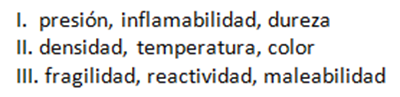 Un ingeniero recibe una muestra metálica para su identificación y empieza describiendo las siguientes propiedades: muestra de volumen pequeño, alta densidad, maleable, alto brillo, muy poco reactivo con los ácidos, no se oxida al ambiente. ¿Cuántas propiedades extensivas se han descrito?