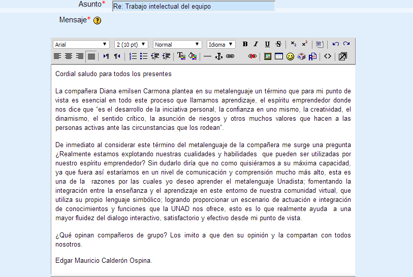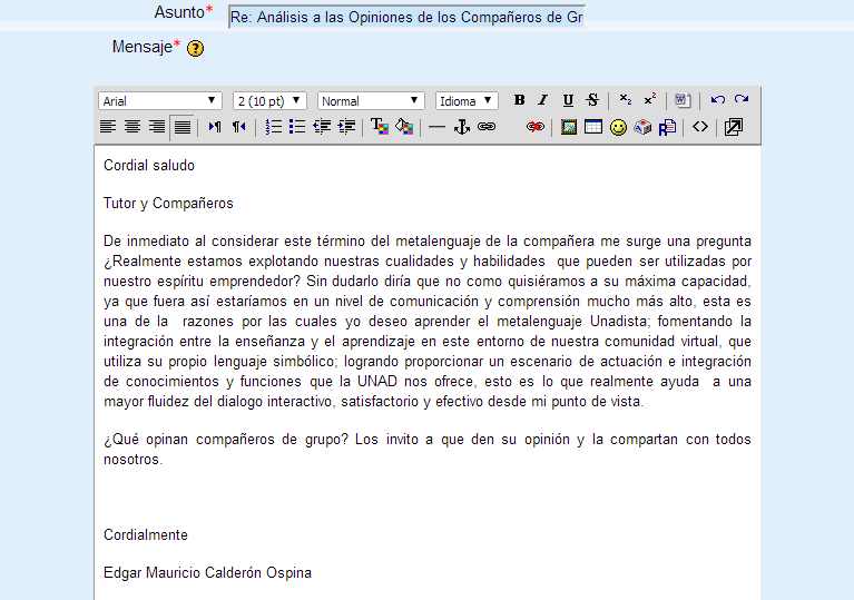 promueve la discusión al traer nuevos elementos o perspectivas. Decir "estoy de acuerdo con" o repetir lo ya planteado, así sea con otras palabras, no ayuda a que la discusión prospere, por esta razón, es necesario que la intervención que se realice sea atractiva, contenga nuevos elementos que permitan fortalecer el análisis y genere entre los compañeros nuevos argumentos para sustentar ideas o aprender colaborativamente. Ser educado en las intervenciones es necesario fundamentar las opiniones con argumentos y no con groserías y así se respeta las opiniones de los demás compañeros.