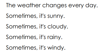 Froggy Jumps RRS3 U5 ReviewOnline version G1 1st Sem. Reading Final Review by Jeewon Moon 1 봄에는 따뜻해요. a In spring, it's warm. b In winter, it’s cold. c In summer, it's cool. 2 a summer b winter c windy 3 가을에는 쌀쌀해요 a It's cool in fall. b In fall, it's hot. c In fall, it's sun. 4 a windy b fall c winter 5 a Sometimes, it’s sunny b Sometimes, it’s rainy. c Sometimes, it’s windy. 6 a cloudy b rainy c sunny 7 어떤 날은 비가 와요. a Sometimes, it’s rainy. b Sometimes, it’s windy. c Sometimes, it’s sunny. 8 a Sometimes, it’s windy. b Sometimes, it’s winter. c Sometimes, it’s cloud. 9 날씨는 계절마다 바뀌어요. a The weather changes every day. b The weather changes every year. c The weather changes every season. 10 날씨는 매일 매일 바뀌어요. a The weather changes every season. b The weather changes every day. c The weather changes every morning. 11 a In summer, it’s hot. b In hot, it's summer. c it's hot in summer. 12 a Sometimes, rainy it's. b It’s rainy, sometimes. c Sometimes, it’s rainy. 13 a The weather changes every season. b The every weather changes season. c The weather every season changes. 14 The weather changes every day a True b False c 15 It is sunny all the time. a True b False c