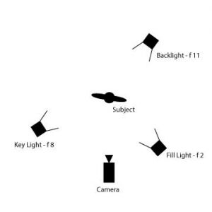 Calculating Light RatiosOnline version In this quiz, you will be tested on your ability to calculate light ratios, also known as contrast ratios, in foot-candles and f-stops. by Denise Taylor 1 What is the stop difference between 500 fc and 125 fc? a 1 stop b 2 stops c 3 stops d 4 stops 2 The key light measures 240 fc and the fill light measures 30 foot candles. How much brighter is the key light to the fill light? a 2 time brighter b 4 times brighter c 8 times brighter d 16 times brighter 3 What is the stop difference in an 8:1 ratio? a 1 stop b 2 stops c 3 stops d 4 stops 4 Which of the following light ratios would be considered the most dramatic? a 1:1 b 2:1 c 4:1 d 8:1 5 How many stops are between f 2.8 and F 5.6? a 1 stop b 2 stops c 3 stops d 4 stops 6 A key light that is measuring at an f stop value of f 11 and a fill light that is measuring an f stop value of f 5.6 has a stop difference of 2 stops. How many times brighter is the key light to the fill light? a 2 times brighter b 4 times brighter c 6 times brighter d 8 times brighter 7 Which of the following ratios would best describe a key light that is twice as bright as the fill light? a 2:1 b 4:1 c 8:1 d 16:1 8 What is the stop difference in a ratio of 32:1? a 4 stops b 5 stops c 16 stops d 32 stops 9 An f-stop and a stop are the same thing. a True b False 10 Which light ratio is represented in this diagram? a 2:1 b 4:1 c 8:1 d 16:1