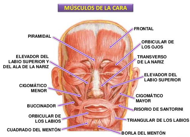 Musculatura facialOnline version Identificar los músculos de la cara by Yolanda Checa de la Rosa 1 Músculo que nace de la aponeurosis epicraneana y se inserta en la piel, en la parte baja de la frente cercano a las cejas 2 Denominado también: músculo Prócero 3 Es un músculo par, pequeño y conoideo 4 Permiten abrir y cerrar los párpados 5 Es un músculo aplanado, triangular y delgado 6 Músculo que se inserta en el pericondrio y la piel del cartílago alar mayor de la naiz 7 Evita que nos mordamos las mejillas al comer 8 Músculo que consta de dos partes: Una porcción central llamada labial y otra periférica llamada marginal 9 Músculo depresor labial inferior 10 Se encarga de retraer las comisuras labiales 11 Con este músculo te permite succionar los labios, lanzar besos... 12 Músculo sinérgico del elevador y eversor del labio superior 13 Está inervado por el nervio Infraorbitario (V2) 14 Este músculo desplaza hacia abajo la comisura de la boca, está irrigado por la arteria facial e inervado por las ramas mandibulares del nervio Facial 15 Eleva la mandíbula y participa en la masticación