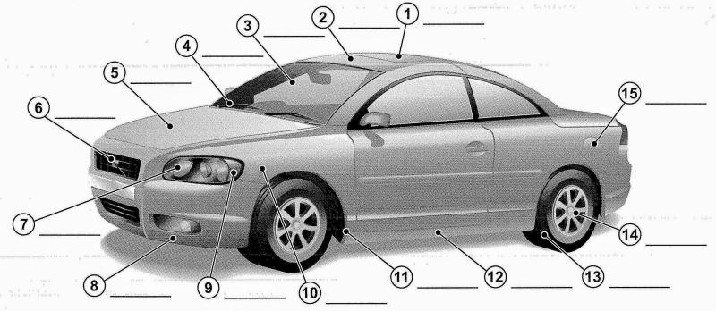 PARTS OF THE CAR (D)Online version Mapa interactivo con las partes del automovil by Evelyne Rodriguez Hilario 1 SLIDING ROOF 2 ROOF 3 WINDSHIELD 4 WIPER WASHER 5 HOOD 6 RADIATOR 7 HEAD LIGHTS 8 BUMPER 9 INDICATOR LIGHTS 10 FRONT FIN 11 FRONT MUDGUARD 12 TIRE 13 GASOLINE TANK