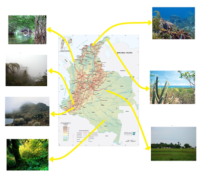 Mapa de Ecosistema Colombiano (D)Online version En este recurso se trabaja sobre el siguiente mapa de ecosistemas Colombiano, perteneciente a la unidad 3 'Planes de recuperación, conservación y manejo de especies amenazadas'. Por medio de este mapa interactivo se busca que el estudiante logre distinguir los distintos ecosistemas. by Yuly Alexandra Pirazan Zambrano 1 Manglares 2 Bosques de Niebla 3 Páramo 4 Selva Tropical 5 Arrecifes 6 Bosque Seco Tropical 7 Sabanas y Morichales