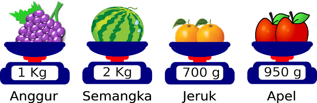 Froggy Jumps Soal satuan berat kelas 3 SDOnline version MATERI MATEMATIKA KELAS 3 TEMA 3 SUBTEMA 3 by rohana hutajulu 1 Hasil dari 25 kg adalah . . . gram a 25 b 250 c 25000 2 Hasil dari 3.500 g adalah . . . hg. a 3,5 b 35 c 350 3 Hasil dari 12.000 mg adalah . . . gram. a 12 b 120 c 1200 4 Hasil dari 7 dag adalah . . . gram. a 70 b 7 c 700 5 Yang merupakan satuan berat adalah .... a detik b kilometer c ton 6 1 kg = ......gram a 1 b 100 c 1000 7 Kak Suci membeli 5 kg jeruk, 1 kg apel, dan 2 kg duku. Total belanjaan Kak Suci adalah ... gram a 6 kg b 7 kg c 8 kg 8 Kak Dika membeli 2 kg jeruk dan 3 kg apel. Total belanjaan Kak Suci adalah ... gram a 500 b 5000 c 50 9 Buah yang paling berat adalah buah ..... a semangka b anggur c apel 10 berat rama 16 kg berat rai 27 kg berat raya 25 kg berat badan yang paling ringan adalah ..... a Raya b Rai c Rama