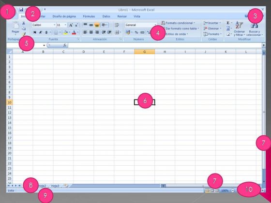 Entorno de ExcelOnline version Los alumnos deben de identificar las partes que componen la ventana principal de la hoja de calculo Excel. by Adrián Foronda Rincón 1 Boton Office 2 Barra de Titulo 3 Barra de Formulas 4 Botones de Control 5 Banda de Opciones 6 Celda 7 Barra de Desplazamiento Vertical 8 Barra de Etiquetas 9 Barra de Estado 10 Barra de Desplazamiento Horizontal 11 Control de Zoom