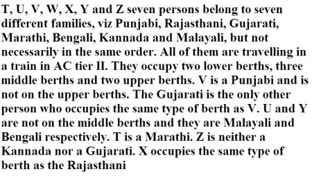 reasoning26Online version reasoning26 by infomind tests 1 Z belongs to which of the following families? a Rajasthani b Kannada c Gujarati d Bengali e None of these 2 Which of the following pairs occupy the lower berth? a U, V b Y, U c W, V d T, V e None of these 3 Who belongs to the Gujarati family? a Y b W c X d Z e none of these 4 Which of the following combinations is true? a W – Gujarati – Upper b Y – Bengali – Lower c X – Kannada – Lower d Z – Rajasthani – Middle e None of these 5 Which of the following groups occupies the middle berths? a Z, Y, U b Z, X, V c X, T, Z d W, T, X e None of these