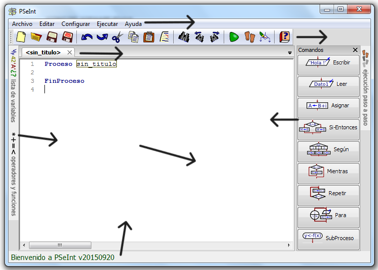 Mapa interactivo de Pseint Online version seleccione las partes mencionadas by Gil Sanchez Cristhian David 1 Pestaña de trabajo 2 Panel de comandos 3 Area de trabajo 4 Listado de funciones y variables 5 Informacion de ejecusion 6 Barra de menu 7 Barra de acceso rapido