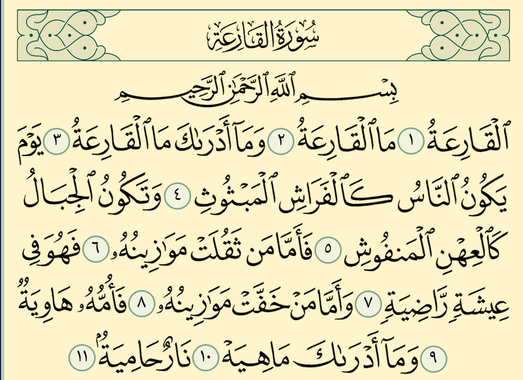Froggy Jumps اختبار سورة القارعةOnline version اختبر معرفتك بسورة القارعة من القرآن الكريم مع هذا الاختبار! by Shereen Ibrahim Mohamed Ibrahim 1 ما اسم هذه السورة؟ a القارعة b العلق c التين 2 كم عدد آيات سورة القارعة؟ a 7 آيات b 15 آية c 11 آية 3 ما هي السورة التي تبدأ بـ 'القارعة'؟ a سورة القارعة b سورة الفاتحة c سورة الناس 4 ما هو الحدث الذي يشير إليه اسم سورة القارعة؟ a ليلة القدر b يوم عرفة c يوم القيامة 5 ....من ثقلت حسناته سيدخل a الجنة b النار c الجحيم 6 ....من خفت حسناته سيدخل a النار b الجنة c الفردوس 7 ...هاوية" اسم من أسماء" a النار b النعيم c الجنة 8 أكمل الآية الآتية: "يَوۡمَ يَكُونُ ٱلنَّاسُ a كَٱلۡفَرَاشِ ٱلۡمَبۡثُوثِ b كَٱلۡعِهۡنِ ٱلۡمَنفُوشِ c .. 9 أكمل ما بعد الآية: فَأَمَّا مَن ثَقُلَتۡ مَوَٰزِينُهُۥ a فَهُوَ فِي عِيشَةٖ رَّاضِيَةٖ b فَأُمُّهُۥ هَاوِيَةٞ c .. 10 أكمل ما بعد الآية: وَأَمَّا مَنۡ خَفَّتۡ مَوَٰزِينُهُۥ a فَهُوَ فِي عِيشَةٖ رَّاضِيَةٖ b فَأُمُّهُۥ هَاوِيَةٞ c ..