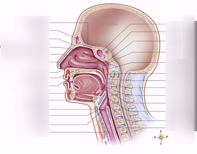 Structures of the upper respiratory tract (sagittal section)Online version Label by Vanessa Klassen 1 Nasal Conchae Superior 2 Nasal Conchae Middle 3 Nasal Conchae Inferior 4 Nasal Meatus Superior 5 Nasal Meatus Middle 6 Nasal Meatus Inferior 7 Frontal Sinus 8 Sphenoid Sinus 9 Cribriform plate of ethmoid bone 10 Pharyngeal Tonsil 11 Hard palate 12 Nasopharynx 13 Soft Palate 14 Uvula 15 Palatine tonsil 16 Oropharynx 17 Epiglottis 18 Laryngopharynx 19 Esophagus 20 Lingual tonsil 21 Hyoid bone 22 Thyroid cartilage 23 Larynx 24 Vocal folds 25 Trachea