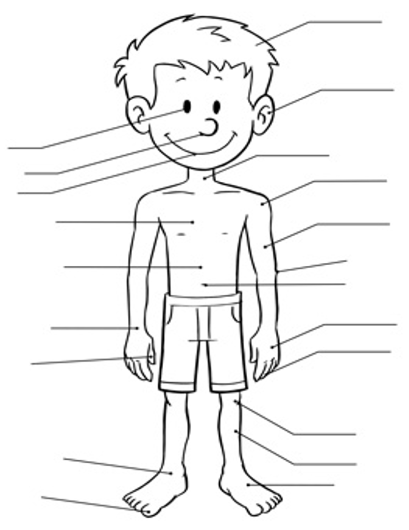 Human Body External Parts (MS)Online version Presione la parte etiquetada, escrita en la parte superior del diagrama del cuerpo humano. (bonus 1) by Jose Freyle 1 HAIR 2 EAR 3 NECK 4 SHOULDER 5 ARM 6 ELBOW 7 NAVEL 8 HAND 9 FINGER 10 KNEE 11 LEG 12 FOOT 13 TOE 14 BELLY 15 CHEST 16 MOUTH 17 NOSE 18 EYE
