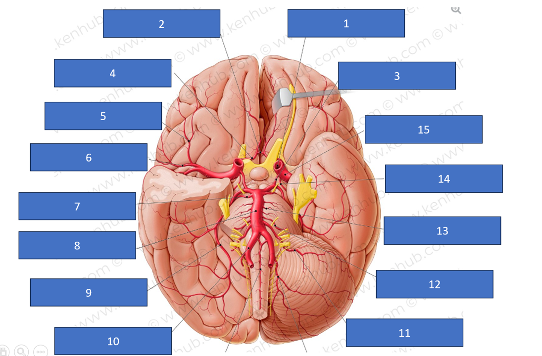Arteries of the brainOnline version health and social care by Mark Kevin Cosico Diacos 1 anterior communicating artery 2 posterior communicating artery 3 anterior cerebral artery 4 lateral orbitofrontal artery 5 prefrontal artery 6 superior cerebral artery 7 internal carotid artery 8 middle cerebral artery 9 verterbral artery 10 anterior inferior cerebellar artery