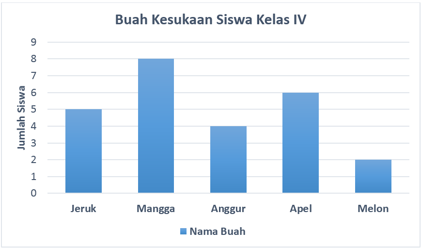 Froggy Jumps EVALUASI MATEMATIKA KELAS IVOnline version MATERI DIAGRAM BATANG by Shalihah Syifaanddini 1 Berapa banyak siswa kelas IV yang menyukai buah mangga ? a 9 b 8 c 6 2 Hitunglah jumlah siswa kelas IV yang menyukai buah jeruk dan apel? a 11 b 13 c 9 3 Apa buah yang paling banyak dan paling sedikit disukai siswa? Hitunglah selisih keduanya? a 6 b 4 c 3 4 Berdasarkan diagram batang berikut, berapa jumlah keseluruhan warga dari RT 1 sampai RT 4? a 250 b 340 c 370 5 Berdasarkan diagram batang yang telah ditampilkan tadi, urutkan jumlah warga dari yang paling sedikit ke paling banyak a RT 2, RT 3, RT 1, RT 4 b RT 3, RT 1, RT 4, RT 3 c RT 4, RT 2, RT 3, RT 1