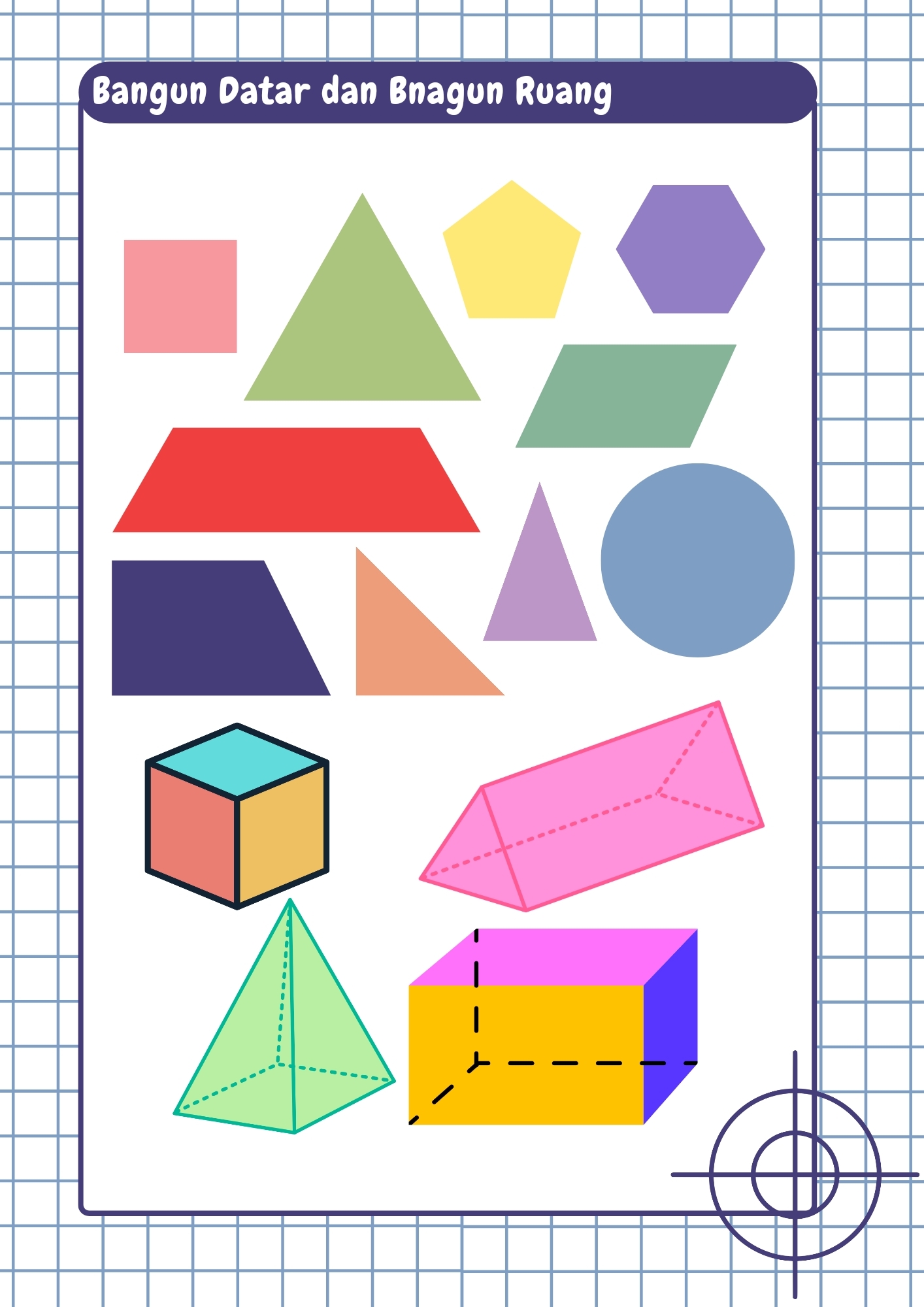Nama Bangun Datar dan Bangun RuangOnline version Matematika Kelas 2 Materi Bangun Datar dan Bangun Ruang by LOKIKA NITYAMA NINDHITA 1 Persegi 2 Segitiga sama sisi 3 Segilima 4 Segienam 5 Trapesium sama kaki 6 Jajar genjang 7 Trapesium siku-siku 8 Segitiga siku-siku 9 Segitiga sama kaki 10 Lingkaran 11 Kubus 12 Prisma segitiga 13 Limas segiempat 14 Balok