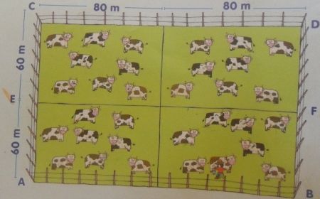 Matemáticas 4° examen 1Online version Observa la figura y responde las preguntas de acuerdo a la imagen. by Alba Rocio David Hernández 1 Observa la imagen y desarrolla el examen. Tenga en cuenta que solo hay una respuesta correcta. El corral de la ilustración tiene 4 lotes, el perímetro de cada lote es: a 480m b 280m c 140m d 240m 2 El área de cada lote es. a 480m b 560m2 c 280m d 4.800m2 3 El total de vacas que se observan en los lotes es: a 30 b 32 c 35 d 36 4 La cifra que indica el área total de cada lote es divisible entre: a 7 b 9 c 2 d 11 5 La linea EF con relación a la línea AB es. a Perpendicular b Paralela c Oblicua d Curva Explicación 1 La respuesta es 280 mts porque cada lote tiene 80cm de largo por 60 cm de ancho y para hallar el perímetro se suman todos los lados. 2 Recordemos que el área se halla multiplicando la base por la altura y se expresa en unidades cuadradas. en este caso como es un rectángulo se multiplica la longitud del ancho 60m por la longitud del largo 80m dando como total 4.800m2