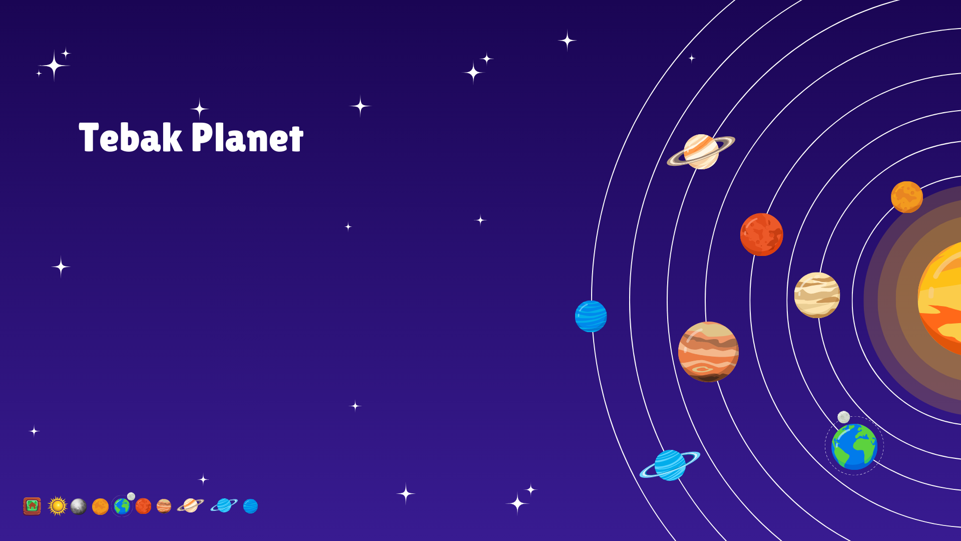 Tebak PlanetOnline version Game ini bertujuan untuk mengenalkan peserta akan nama-nama planet yang ada di tata surya by Muhammad Nasir Hafizh 1 Matahari 2 Merkurius 3 Venus 4 Bumi 5 Bulan 6 Mars 7 Jupiter 8 Saturnus 9 Uranus 10 Neptunus Penjelasan 1 Matahari adalah pusat tata surya kita yang menjadi sumber energi semua planet di Galaksi Bima Sakti. 2 Merkurius adalah planet terdekat Matahari. Planet ini sangat panas di siang hari dan sangat dingin di malam hari. Merkurius adalah planet terkecil di Tata Surya. 3 Venus adalah planet terpanas di Tata Surya. Ini memiliki atmosfer yang tebal dan banyak awan. Kadang-kadang disebut "planet kembar" dengan Bumi karena ukurannya yang hampir sama. 4 Bumi adalah rumah kita! Bumi ini adalah satu-satunya planet yang kita ketahui memiliki kehidupan. Bumi memiliki air, udara, dan segala sesuatu yang kita butuhkan untuk hidup.. 5 Bulan adalah satelit bumi. Bumi bergerak mengelilingi Bumi dan dinamakan revolusi. 6 Mars sering disebut "Planet Merah" karena warnanya yang kemerahan. Ini memiliki gunung tertinggi dan lembah terdalam di Tata Surya. Ilmuwan telah menemukan bukti bahwa air pernah ada di Mars. 7 Jupiter adalah planet terbesar di Tata Surya. Ini memiliki banyak satelit dan cincin. Jupiter adalah gas raksasa dengan badai besar yang dikenal sebagai "Great Red Spot". 8 Saturnus memiliki cincin yang terkenal. Ini adalah planet gas raksasa seperti Jupiter. Planet Saturnus memiliki lebih dari 80 satelit alami. 9 Uranus terkenal karena sumbunya yang berbaring. Ini adalah planet gas raksasa yang sangat dingin. Uranus memiliki 27 satelit yang terkenal. Uranus juga memiliki cincin seperti saturnus. 10 Neptunus adalah planet terjauh dari Matahari. Ini juga merupakan planet gas raksasa yang dingin. Neptunus memiliki badai besar yang disebut "The Great Dark Spot".