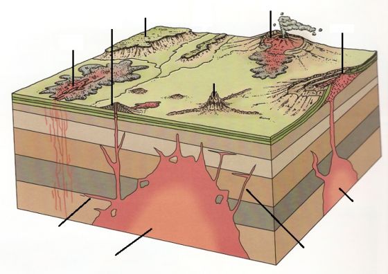 Igneous FeaturesOnline version Label the items of igneous features by Katherine Stone 1 Batholith 2 Flood Basalt 3 Caldera 4 Laccolith 5 Basalt Plateaus 6 Sill 7 Dike 8 Cinder Cone 9 Stock 10 Volcanic Neck