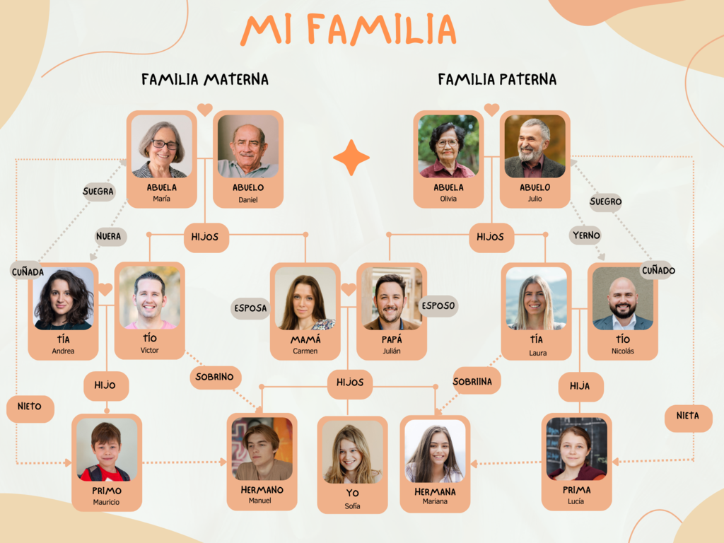 Miembros de la familiaOnline version Miembros de la familia La imagen del árbol genealógico que aparece en el quiz fue elaborada por Karen Matos Lopez. by Foteini 1 Daniel es mi .................. a abuelo b padre c nieto d esposo 2 Maria es la ............ de mi tía a suegra b madre c prima d nieta 3 Mariana es la ............. de Laura a sobrina b prima c tía d madre 4 Manuel es mi ............ a hermano b tío c abuelo d nieto 5 Yo soy ............. de Carmen a hija b madre c abuela d sobrina 6 Mauricio es ................. de Mariana a primo b hijo c padre d tío 7 Andrea es ................... de Maria a nuera b hija c prima d nieta 8 Julián es ...................... de Carmen a esposo b padre c primo d sobrino 9 Carmen es ................ de Julián a esposa b sobrina c madre d abuela 10 Olivia es la ................... de Lucía a abuela b madre c hermana d prima
