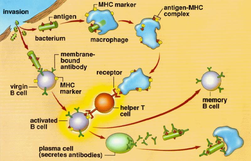 Sistema inmuneOnline version Sigue las instrucciones. Señala según la indicación. by Maria Gamba 1 Los macrófagos muestran los antígenos del virus en su superficie para alertar a los linfocitos 2 Las células B detectan los antígenos del virus en el macrófago, gracias a una célula T mediadora 3 Los linfocitos B producen anticuerpos 4 Los anticuerpos bloquean los antígenos del patógeno 5 Los linfocitos B se hacen a una copia de los anticuerpos en vista de un nuevo ataque