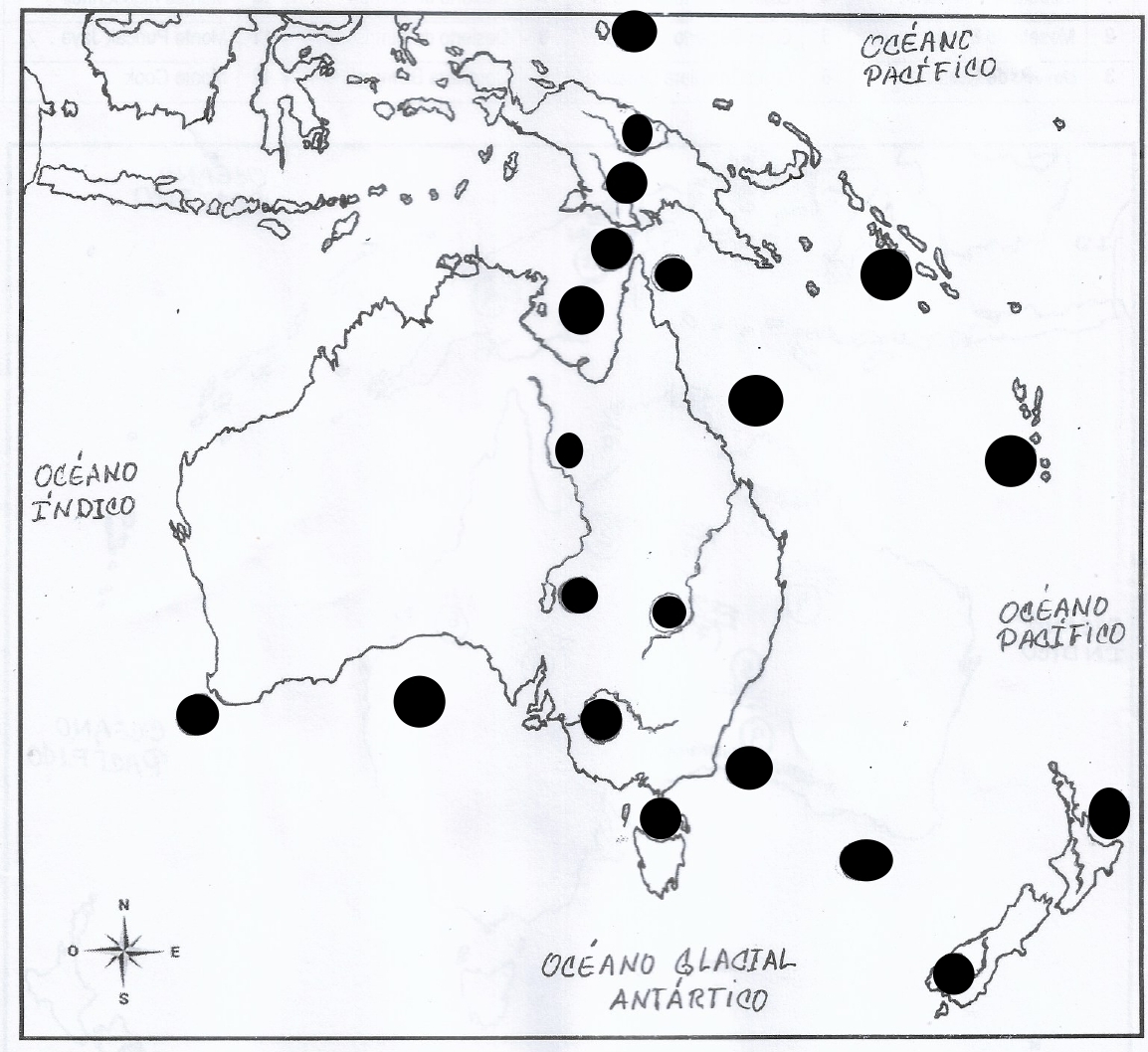 HIDROGRAFÍA Y ACCIDENTES COSTERO DE OCEANIAOnline version La hidrografía de Oceanía se destaca por la Gran Barrera de Coral en Australia, amplios sistemas fluviales como la Cuenca Murray-Darling y numerosos lagos de agua dulce. Los accidentes costeros incluyen impresionantes arrecifes de coral, profundas trincheras oceánicas y costas diversas con acantilados y playas. Rica en biodiversidad y paisajes acuáticos únicos. by lufeva lu 1 Río Darling 2 Río Georgina 3 Rio Flly 4 Río Sepik 5 Río Waitako 6 Río Murray 7 Río Clutha 8 Lago Eyre 9 Cabo Howe 10 Cabo Leeuwin 11 Cabo York 12 Golfo de Carpentaria 13 Estrecho de Torres 14 Estrecho Bass 15 Gran Bahía Australiana 16 Gran Barrera Coralina 17 Islas Salomón 18 Islas Palau 19 Islas Vanuatu 20 Mar de Tasmania