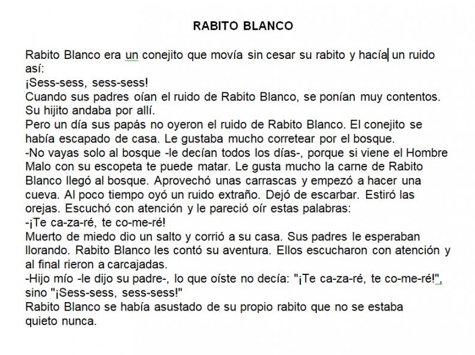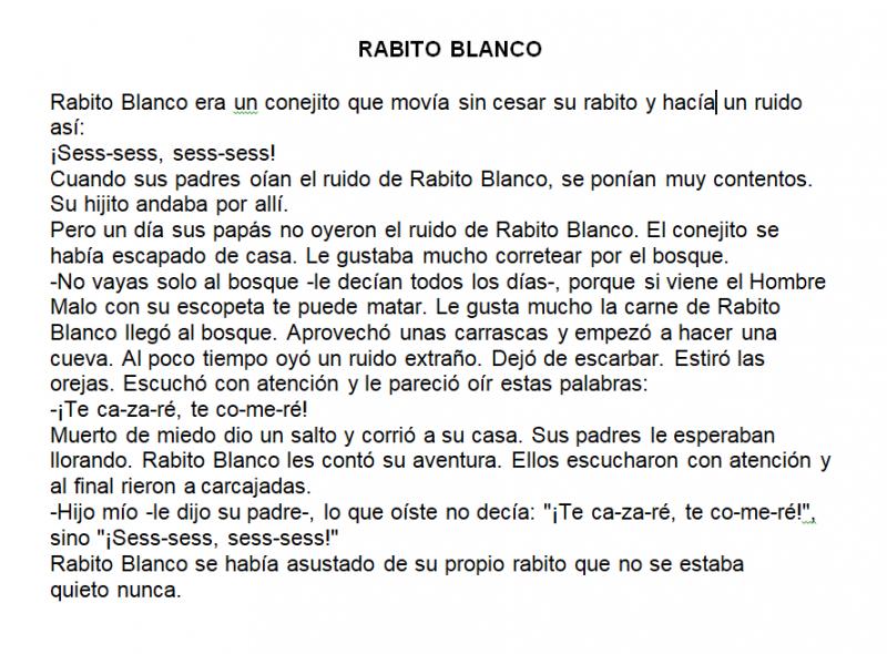 ACTIVIDAD COMPRENSIÓN LECTORA 5to BOnline version Esta actividad esta formada por lecturas acompañadas de preguntas para ejercitar la comprensión de textos. by ENMA HUAMANI ARANA 1 ¿Qué movía sin cesar el conejito? a Sus patas. b Su rabo. c Sus orejas. d Los bigotes. 2 ¿Por dónde le gustaba corretear al conejito? a Por el bosque. b Por el rìo. c Por el prado. d Por la casa. 3 ¿Quién podría venir con la escopeta? a El lobo feroz. b El hombre malo. c El hombre malvado. d El otro amo. 4 ¿Qué escuchó en realidad el conejito? a ¡Te ca-za-ré, te co-me-ré!. b ¡Sess-sess, sess-sess! c ¡Buss-buss, buss-buss! d ¡Buuuuuuuu-uuuuuu! 5 ¿Cómo se dieron cuenta los papás de que Rabito se había ido? a Porque Rabito dejo una nota. b Porque rabito les dijo con tiempo. c Porque no escuchaban su rabito blanco. d Porque discutieron con Rabito. 6 ¿Qué sucedió en el inicio del cuento? a El conejito se perdió en el bosque. b El conejito discutió con sus padres. c El conojito andaba por alli. d El conejito se quedaba en su casa. 7 ¿Qué sucedió al final e la historia? a El conejito se va de la casa. b El hombre malo se lleva al conejito. c El conejito enfrenta al hombre malo. d El conejito se asusta con el ruido de su rabo. 8 ¿Cuál sería otro título para el cuento? a El conejito asustadizo. b El conojito juguetón. c El conejito desobediente. d El conejito dormilon. 9 ¿En qué lugar sucede la historia de Rabito Blanco? a El el bosque. b En un zológico c En el parque. d En una ciudad. 10 La historia de Rabito blanco no es una fábula porque: a tinen una enseñanza escrita. b no tiene una enseñanza escrita. c sus personajes son animales d no es una narración 11 ¿Cuál es el personaje principal de la historia? a El papá. b El hombre malo. c El lobo. d El conejito. 12 ¿Quién era Rabito Blanco? a Perrito b Conejito c Ratoncito d Palomita 13 ¿Por qué sus papás se sentían muy contentos de Rabito Blanco? a oír su risa. b oír su ladrido. c oír su salto. d oír un ruido. 14 Significado de la palabra "carrasca" a Encina, generalmente pequeña, o mata de ella. b Planta de tallo leñoso y elevado, que se ramifica a cierta altura del suelo. c Dar por bueno algo. d Conjunto de obras teatrales o musicales que una compañía, una orquesta. 15 En lectura: ¡ Te ca - za - ré, te co - me - ré - muerto de miedo dio un salto, que quiere decir "muerto de miedo" a Alguien está asustado, y que pronto morirá. b Alguien está agonizando y que pronto morirá. c Alguien está muy asustado, pero no suele referirse a un fallecimiento real. d Alguien esta nervioso y que pronto morirá. 16 ¿De qué se había asustado Rabito Blanco? a Su propio Rabito. b Del cazador con escopeta. c La bulla de la gente. d Del zorro.
