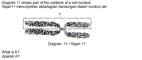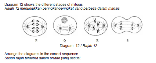 PEMBAHAGIAN SEL BIOLOGI TINGKATAN 4Online version enjoy! by Nur Balqis 1 Rajah menunjukkan satu peringkat mitosis pada tumbuhan. Antara berikut, manakah merupakan peringkat seterusnya? a b c d 2 Rajah menunjukkan satu fasa semasa meiosis. Apakah kepentingan fasa tersebut? a Menghasilkan sel anak yang mempunyai bilangan kroosom yang sama b Menyebabkan pindah silang berlaku anatara kromosom homolog. c Bilangan kromosom dalam sel anak menjadi separuh d Menghasilkan variasi pada gamet 3 a Kulit b Akar c Anter d Jantung 4 a P (Meiosis), R(Interfasa) b P (Interfasa). R(Mitosis) c P (Pertumbuhan), R (Interfasa) d P (Meiosis), R (Pertumbuhan) 5 a Profasa b Anafasa c Metafasa d Telofasa 6 a Pengklonan b Kultur tisu c Menghasilkan sel diploid d Menghasilkan sel haploid 7 a 10 b 20 c 40 d 80 8 a Sinapsis tidak berlaku semasa profasa I b Sitokinesis tidak berlaku semasa telofasa II c Membran nukleus tidak terbentuk semasa telofasa II d Pasangan kromatid tidak terpisah semasa anafasa II 9 Manakah di antara berikut, bukan ciri mitosis a Ia menghasilkan variasi genetik b Mitosis penting untuk menggantikan sel yang mati c Sel yang tercedera boleh diganti dengan penghasilan sel baru yang serupa d Sel baharu yang terbentuk digunakan untuk pertumbuhan dalam organisma 10 Nombor kromosom diploid bagi seekor kucing ialah 38. Jika satu daripada pasangan homolog tidak terpisah semasa meiosis I, berapakah bilangan kromosom yang mingkin didapati pada gamet? a 19 b 18 atau 19 c 18 atau 20 d 38 11 a P (Mitosis), Q (Meiosis), R (Mitosis) b P(Mitosis), Q(Mitosis), R( Meiosis) c P(Meiosis), Q(Mitosis), R(Meiosis) d P(Meiosis), Q(Meiosis), R(Mitosis) 12 Fasa mitosis manakah yang menunjukkan pembentukan awal plat sel dalam sel tumbuhan? a Profasa b Metafasa c Anafasa d Telofasa 13 a Kromosom memendek dan menebal b Kromosom tersusun di satah khatulistiwa c Kromosom homolog berpasangan dan pindah silang berlaku d Kromosom homolog berpisah dan bergerak ke kutub-kutub yang bertentangan 14 a Kromosom b Gen c Kromatid d DNA ganda dua 15 a P,Q,R,S b Q,R,P,S c S,R,Q,P d S,R,P,Q 16 Antara berikut yang manakah merupakan hasil persenyawaan antara organisma P dan organisma Q? a b c d 17 a A b B c C d D 18 a Telofasa b Metafasa c Profasa d Anafasa 19 Apakah nombor diploid bagi kromosom di dalam setiap sel somatik haiwan itu? a 2 b 4 c 8 d 16