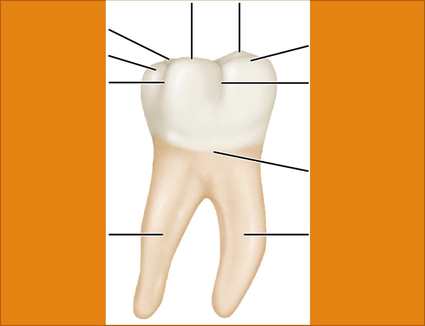 Cara vestibular del 1er Molar Inferior PermanenteOnline version Aprenderás las estructuras presentes en la Cara Vestibular del 1er Molar Inferior Permanente. by VANESSA ESTEFANÍA DONATO RAMÍREZ 1 Cúspide Mesio-Lingual 2 Cúspide Centro-Vestibular 3 Cúspide Disto-Lingual 4 Cúspide Distal 5 Surco de desarrollo Disto-Ocluso-Vestibular 6 Cúspide Mesio-Vestibular 7 Surco de desarrollo Mesio-Ocluso-Vestibular 8 Línea cervical 9 Raíz Mesial 10 Raíz Distal