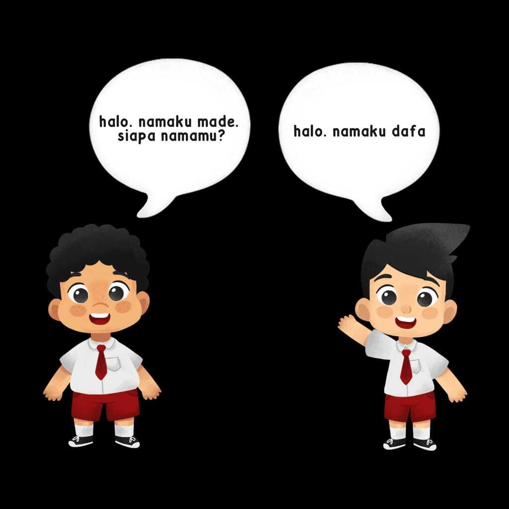 Quiz edukasi bahasa indonesia kelas 1 SD/MIOnline version untuk mengetahui kemampuan siswa dalam materi membaca by alfi nikmah 1 Pada gambar tersebut manakah hewan yang berawalan huruf "J".... a Burung b Gajah c Jerapah d Monyet 2 Benda apa yang digunakan untuk menulis... a b c d 3 Manakah nama buah yang diawali huruf konsonan... a b c d 4 Manakah nama buah yang terdiri dari 2 huruf vokal dan 2 huruf konsonan... a b c d 5 Pada gambar disamping kegiatan apa yang sedang dilakukan Made dan Dafa... a Bermain b Berkenalan c Menonton tv d Mandi Penjelasan 1 Jerapah (Giraffa camelopardalis) adalah hewan mamalia tertinggi di dunia, dengan tinggi mencapai 4,3 hingga 5,7 meter. Ciri khasnya meliputi leher dan kaki yang sangat panjang, serta pola bercak unik pada kulitnya 2 Jawaban yang benar adalah "pencil" karena pencil adalah alat tulis yang biasa kita pakai untuk menulis atau menggambar. Pensil terbuat dari kayu yang di dalamnya terdapat batangan grafit. Kalau kita goreskan pensil di kertas, maka akan muncul bekas berupa garis atau coretan. 3 Pada gambar diatas sebagian besar buah dalam pilihan diawali dengan huruf vokal ("A"), kecuali "Jeruk" yang diawali dengan huruf konsonan ("J"). Oleh karena itu, jawaban yang tepat adalah Jeruk . 4 Karena Kata "apel" bisa terdiri dari dua huruf vokal dan dua huruf konsonan karena huruf vokal dalam kata "apel" adalah "a" dan "e" dan huruf konsonan dalam kata "apel" adalah "p" dan "l". 5 Gambar menunjukkan dua orang anak yang bernama Made dan Dafa yang sedang berkenalan. Karena mereka berkenalan diawali dengan Kata "halo" dan "namaku" adalah ungkapan yang umum digunakan saat seseorang ingin memperkenalkan diri.Mereka sedang saling memperkenalkan nama masing-masing sebagai langkah awal untuk memulai pertemanan.