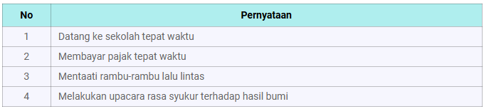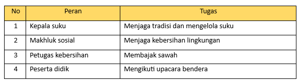 Peranku di Lingkungan Sekolah dan MasyarakatOnline version Kerjakan quiz ini dengan benar dan tepat! by Marz Z 1 Orang pada gambar di atas memiliki tugas untuk..... a memarahi peserta didik b mengajar peserta didik c mengatur keuangan sekolah d menjual makanan di sekolah 2 Pak Budi bertugas untuk mengelola kebijakan sekolah dan menjalin komunikasi dengan warga sekolah. Peran dari Pak Budi yaitu. . . a guru b peserta didik c kepala sekolah d petugas perpustakaan 3 Perhatikan tabel berikut! Pasangan peran dan tugas yang tepat ditunjukkan oleh nomor. . . a 1 dan 2 b 2 dan 3 c 3 dan 4 d 1 dan 4 4 Winda memimpin kegiatan diskusi kelompok, sedangkan Agus mengerjakan tugas sesuai kesepakatan kelompok. Peran Agus yaitu. . . a anggota kelompok b ketua kelompok c ketua kelas d sekretaris kelas 5 Perhatikan gambar berikut! Tugas orang yang ditunjukkan oleh gambar yaitu . . . a menertibkan kendaraan di jalan b mengikuti kegiatan kerja bakti c menjaga keamanan lingkungan masyarakat d menjaga kebersihan lingkungan masyarakat 6 Diana berperan sebagai peserta didik di sekolah. Namun dia berperan sebagai warga masyarakat di sekitar rumah. Tugas dari Diana sebagai warga masyarakat yaitu. . . a menjaga kebersihan lingkungan b menegur teman yang mencontek c menghukum masyarakat yang mencuri d mengantri di kantin sekolah 7 Gambar tersebut menunjukkan bahwa setiap orang harus mentaati. . . a peraturan tertulis b peraturan tidak tertulis c peraturan sekolah d norma masyarakat 8 Perhatikan tabel berikut! Contoh peraturan tidak tertulis ditunjukkan oleh nomor. . . a 1 b 2 c 3 d 4 9 Hal yang tidak boleh kita lakukan ketika berada di taman bermain yaitu . . . a menggunakan fasilitas yang ada b memotret pemandangan sekitar c mengajak teman-teman bermain d membuang sampah sembarangan 10 Akibat yang terjadi apabila kita menyerobot antrian ketika membayar jajanan di kasir yaitu . . . a tidak nyaman karena kotor b orang tua menjadi khawatir c menimbulkan pertengkaran d sanksi administrasi 11 Yuda menyapu kelas. Yuda telah melaksanakan tugasnya sebagai . . . a anggota kelompok b petugas piket kelas c peserta upacara d warga masyarakat 12 Perhatikan gambar tersebut! Akibat dari pelanggaran pada gambar tersbut yaitu . . . a merasa malu b mendapat sanksi tegas c menimbulkan pertengkaran d menjadi tidak nyaman 13 Banu membersihkan meja guru di kelas. Tidak sengaja dia menjatuhkan vas bunga hingga pecah. Banu membelikan vas bunga baru dan meminta maaf kepada guru. Tindakan Banu menunjukkan . . . a peran b tugas c kewajiban d tanggung jawab 14 Aku adalah siswa kelas IV di SD Negeri Kedungbenda 02. Tanggung jawabku yaitu . . . a datang ke sekolah sesuka hati b mengikuti upacara dengan tertib c membuang sampah di kolong meja d mengerjakan PR di sekolah 15 Perhatikan gambar tersebut! Gambar tersebut menunjukkan interaksi yang ada di lingkungan. . . a rumah b sekolah c masyarakat d internasional 16 Interaksi dapat terjadi dimana pun dan kapan pun. Berikut ini yang bukan merupakan tujuan dilakukannya interaksi sosial yaitu. . . a menjalin persahabatan b bertukar informasi c menjadi mahkluk individual d menambah ilmu dan pengetahuan 17 Berikut ini salah satu contoh bentuk interaksi di sekolah yaitu. . . a bergotong royong membangun jembatan b bersama-sama membersihkan lingkungan desa c menghadiri acara syukuran tetangga d berdiskusi dalam kelompok 18 Lani sedang makan di tempat umum. Hal baik yang harus dilakukan yaitu. . . a mengantre saat membeli makanan b menggunakan seragam olahraga c membantu teman yang kesulitan d tidak menjaga kebersihan 19 Perhatikan gambar berikut! Gambar tersebut menunjukkan bahwa interaksi yang dilakukan oleh manusia yaitu. . . a antarindividu b individu dengan kelompok c individu dengan benda mati d individu dengan alam 20 Interaksi sosial yang dilakukan oleh manusia tidak selalu memberikan hal positif. Misalnya terjadi perselisihan. Hal tersebut terjadi karena manusia. . . . a memiliki tujuan yang sama b memiliki fisik yang berbeda c memiliki peran sebagai mahkluk sosial d memiliki sifat dan karakter berbeda