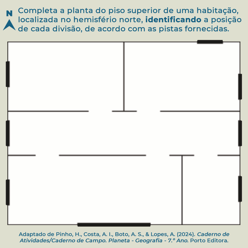Localização Relativa - Orientação pelo SolOnline version Completa a planta do piso superior de uma habitação, localizada no hemisfério norte, identificando a posição de cada divisão, de acordo com as pistas fornecidas. by Bruno Carvalho 1 Casa de Banho 2 Corredor 3 Sala de Estar 4 Escritório 5 Quarto