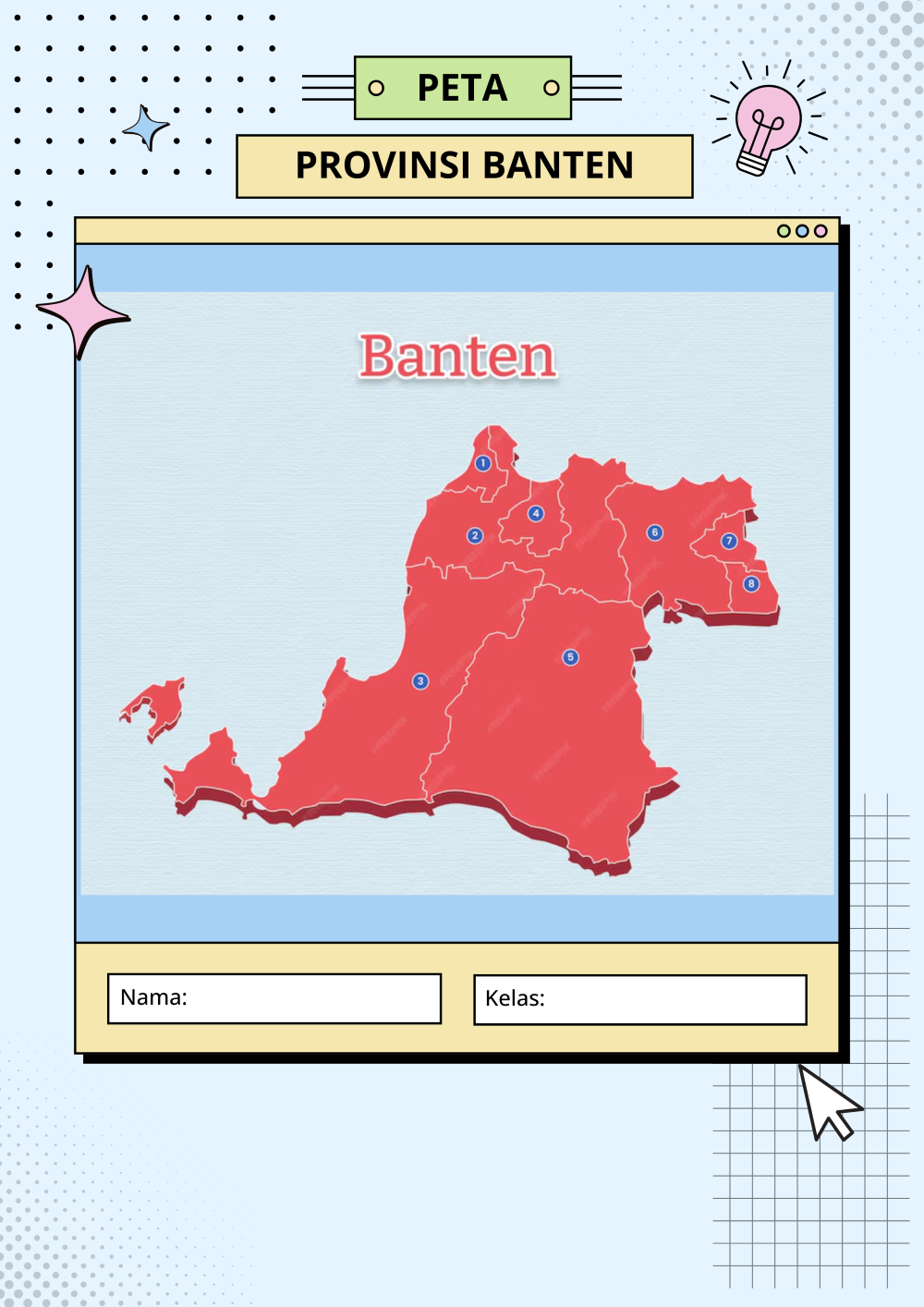 Peta Provinsi BantenOnline version Memilih Kota atau Kabupaten di Provinsi Banten by ADE REDA RUKNA 1 Kota Cilegon 2 Kabupaten Serang 3 Kabupaten Pandeglang 4 Kota Serang 5 Kabupaten Lebak 6 Kabupaten Tangerang 7 Kota Tangerang 8 Kota Tangerang Selatan