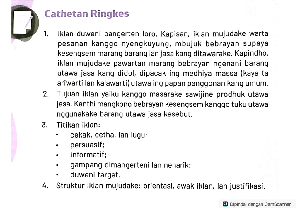 Froggy Jumps Bahasa Jawa kelas 8Online version Diberikan materi tentang Iklan dan Siswa diharapkan dapat memahaminya dan mengerjakan latihan soal by Erna Pujiati 1 Cah, materi iki ana ing kaca 128-130. Terus sampean waca lanjutane dhewe. Iklan iku kudu bisa mbujuk lan ngajak pawongan nindaake sawijining Bab. Iki mujudake titikan iklan ...... a persuasif b informatif c duweni target 2 Iklan sing nggunakake basa manca bakal dialihbasakake luwih dhisik. Iki mujudake titikan iklan ... a persuasif b informatif c dimangerteni 3 Struktur iklan kang wiwitan yaiku... a abstraksi b orientasi c awak iklan 4 Mujudake reklame kang didhapuk secara ringkes, padhet lan cetha mawa medhiya kain utawa sebangsane Mangkane iki aran ... a spandhuk b billboard c poster 5 Neon box mujudake reklame kang digunakake ing.... a njaba area kanthi lampu b njero area kanthi lampu c njaba area tanpa lampu