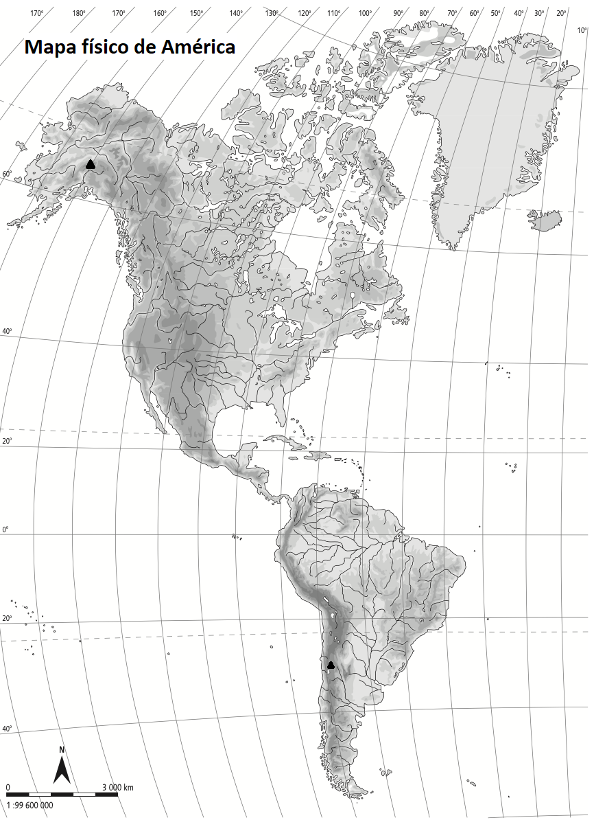 Mapa físico de AméricaOnline version Mapa físico del continente americano by Carlos García Esparza 1 río Misisipi 2 río Colorado 3 río Bravo 4 río Amazonas 5 río Orinoco 6 río de la Plata 7 lago Titicaca 8 lago Maracaibo 9 Grandes Lagos 10 monte Denali 11 monte Aconcagua 12 montañas Rocosas 13 sierra Madre 14 Grandes Llanuras 15 montes Apalaches 16 cordillera de los Andes 17 meseta del Mato Grosso 18 Patagonia 19 la Pampa 20 isla de Groenlandia 21 isla de Terranova 22 isla de Cuba 23 isla de La Española 24 islas Malvinas 25 archipiélago de las Antillas 26 estrecho de Bering 27 cabo de Hornos 28 golfo de México 29 golfo de California 30 bahía de Hudson 31 península de Florida 32 península del Yucatán 33 mar Caribe 34 océano Atlántico 35 océano Pacífico 36 ecuador 37 trópico de Cáncer 38 trópico de Capricornio 39 río Paraguay 40 península del Labrador