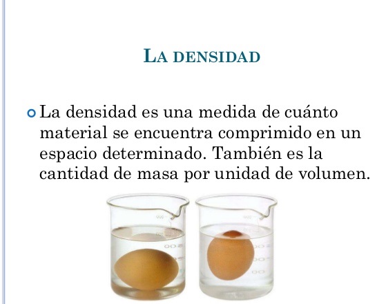 DensidadOnline version Relación entre la masa y el volumen de una sustancia. by Patricia del pilar Molano Ruiz 1 Densidad Densidad: Relación entre la masa y el volumen de una sustancia. 2 imagen densidad 3 Densidad del agua 4 sustancias Todas las sustancias que existen tienen densidad.ya existen tablas con los datos de muchas de ellas. 5 tabla 6 unidades La densidad se expresa en gramos por centímetro cúbico.Densidad: gr/cm3 7 explicación Dado que el volumen se expresa en centímetros cúbicosla masa en gramosde ahí la densidad en gr/cm3